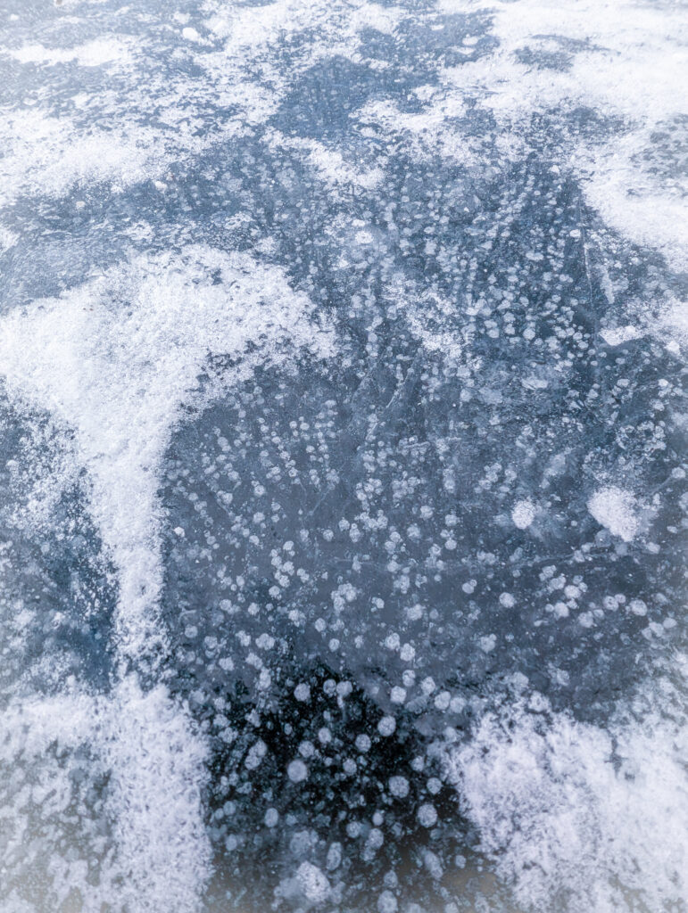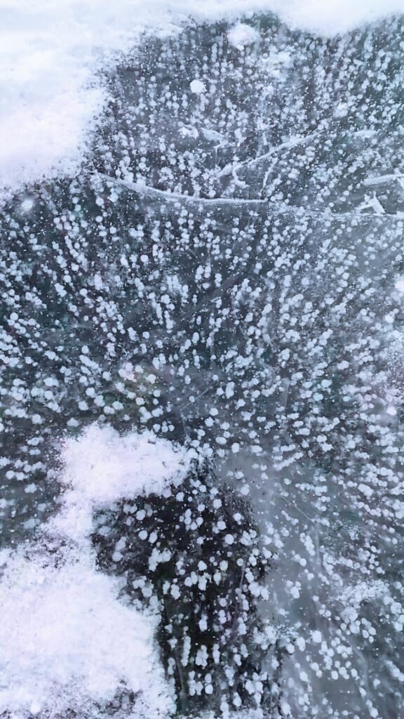 ネット記事の引用となるがこれは「湖底から発生したガスの気泡が、そのまま氷の中に閉じ込められる」現象のようだ。つまり、湖の中に凍った泡が見えるってこと?