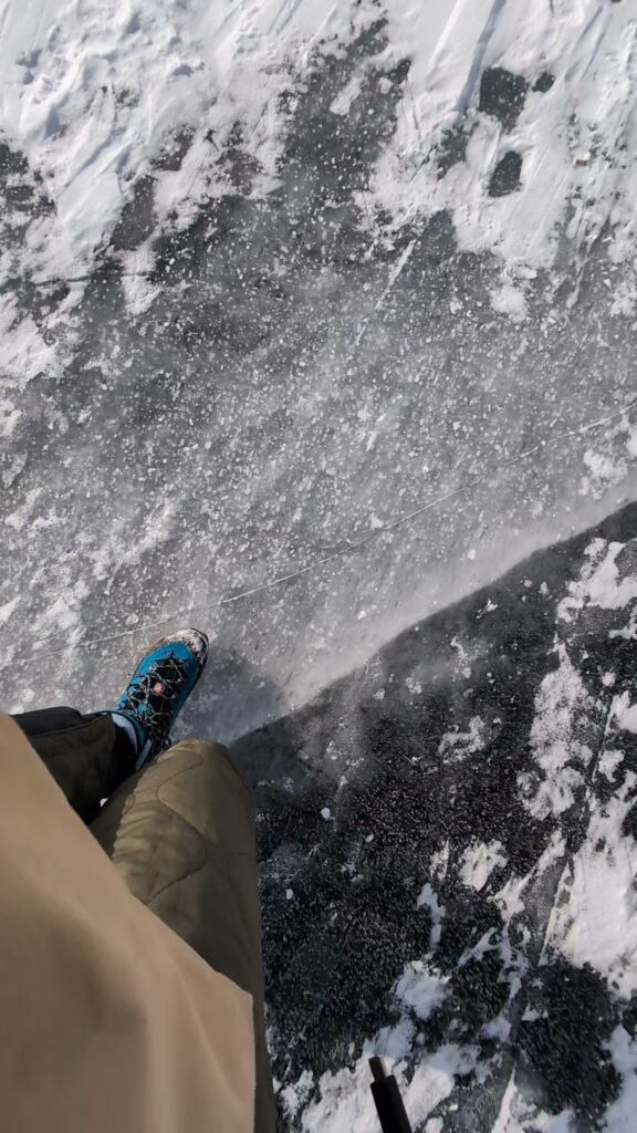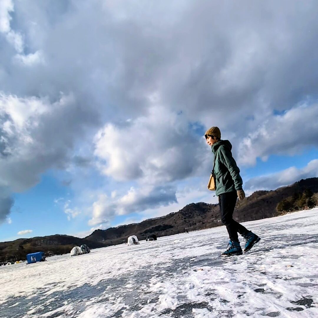 恐る恐る、氷の上を歩いてみます。