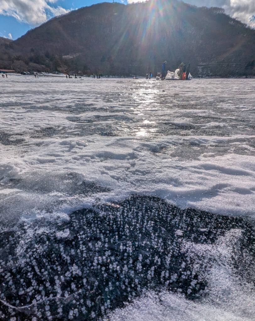 湖の上に雪が積もってしまうと、アイスバブルは見れなくなります。
