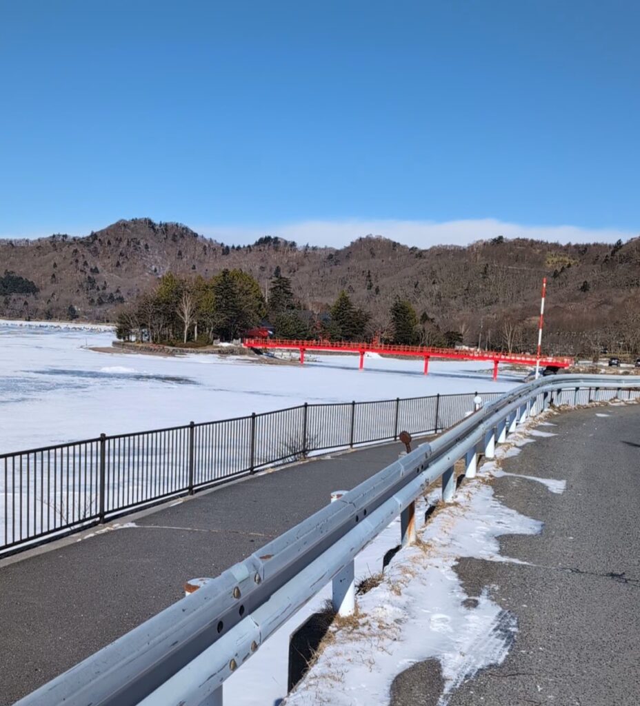 車道をトコトコ歩いて行くと、赤城神社が見えました。白い大沼に赤い橋?が映えますねえ。