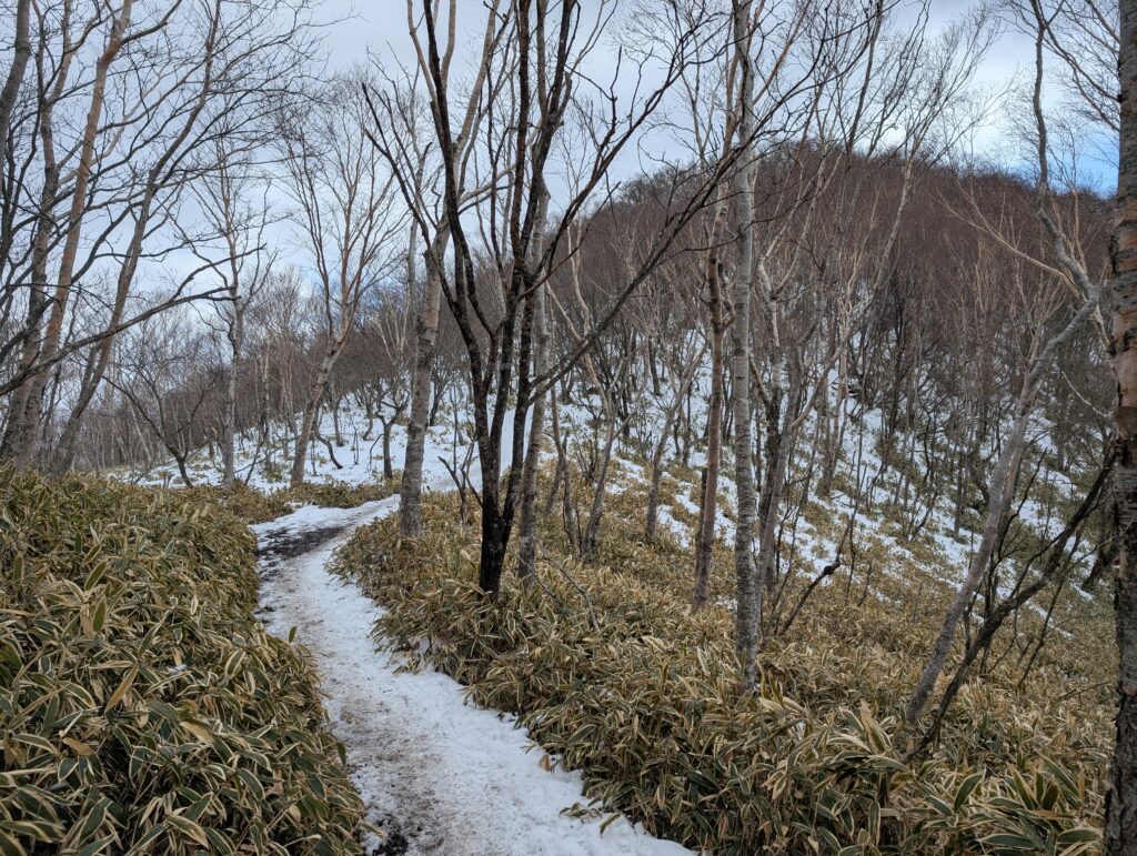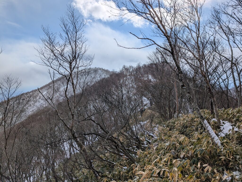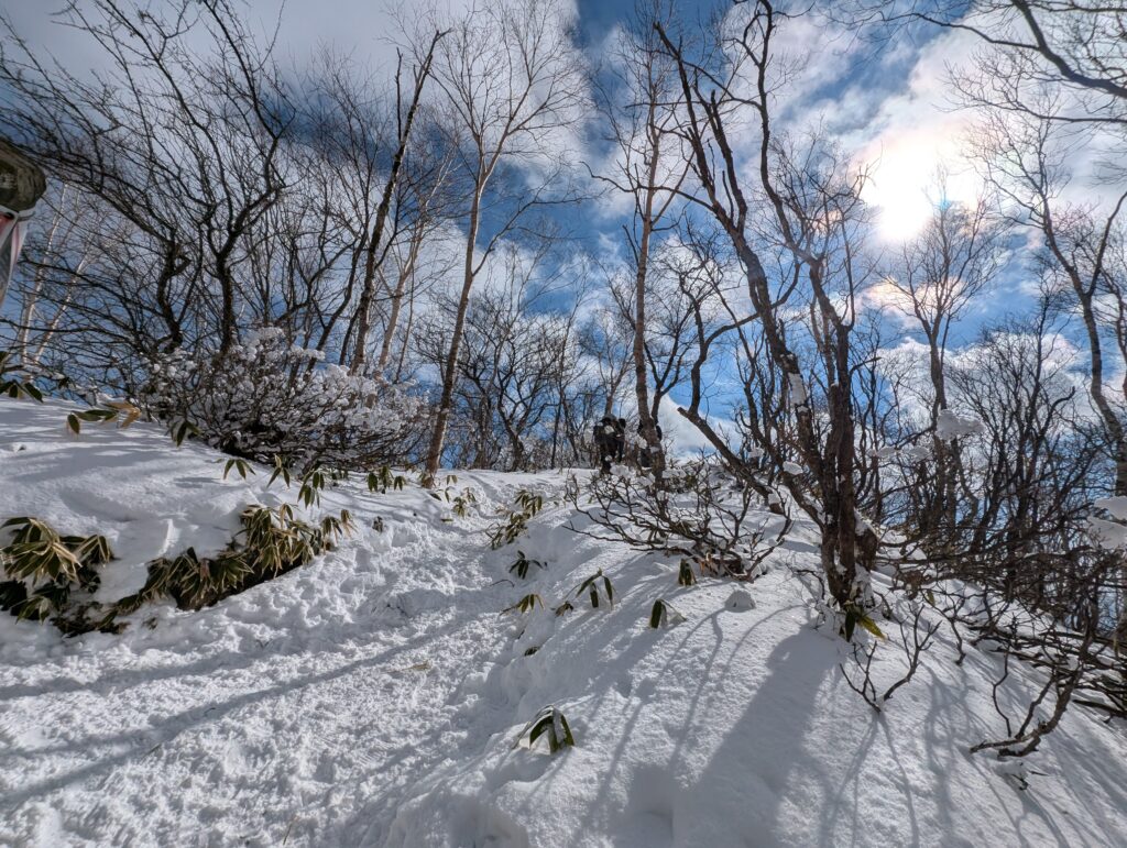 汗だくになりながら登って行くと、いい感じに登りの終着点が見えてきた。樹氷ねらったんですが、気温高いとすぐなくなっちゃうんだね(十分寒いが)。