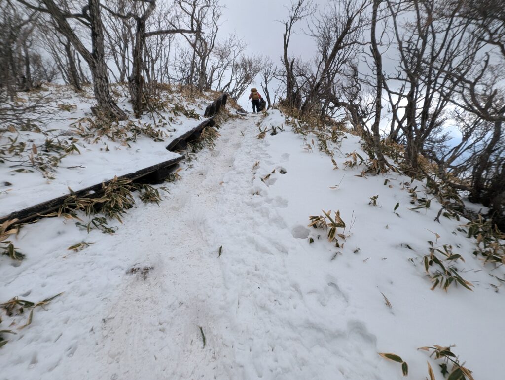 1年前同じコースを登った時は雪もふだったので、アイゼンでよかった。