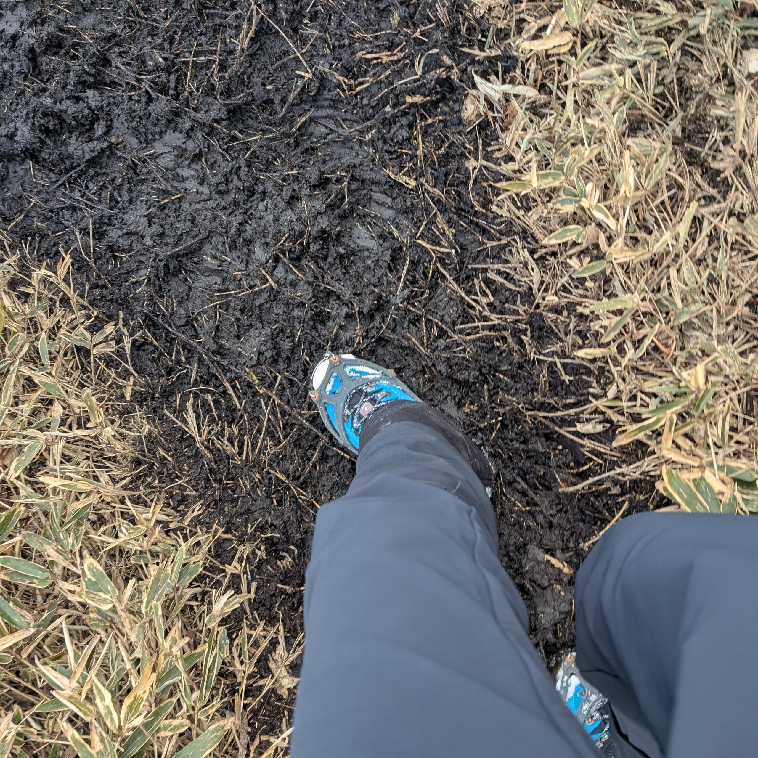 今回は雪が少なく岩肌も見えていたのでチェーンスパイクがちょうどよかった。