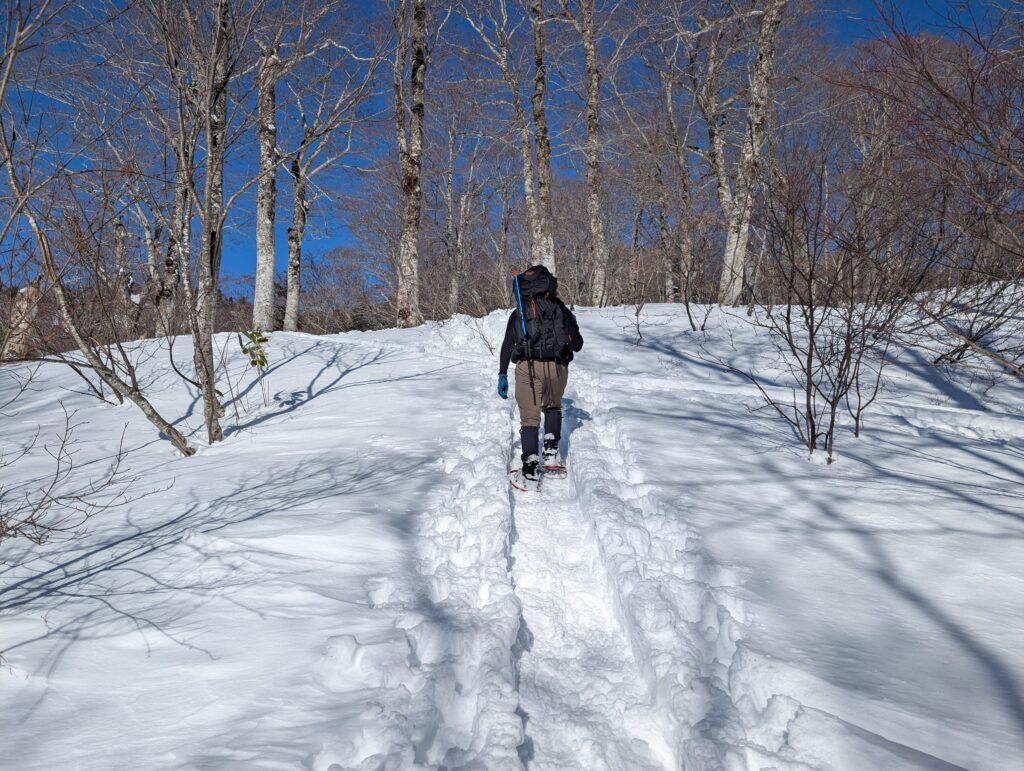体力自慢の彼ですら苦戦するので、私のような弱小ハイカーは心からスノーシューで良かったと思います。アイゼンで来る強者もいました。